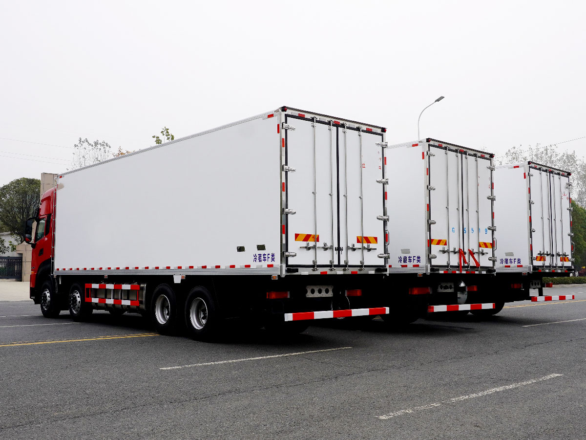 (2)廂板材質:內外壁板選用國內優質玻璃鋼(不吸光、隔熱性好、硬度強、抗氧化);中間保溫層為XPS擠塑聚笨板;廂體厚度8CM。地板采用鋁花紋板,門邊條采用迷宮式橡膠密封條。